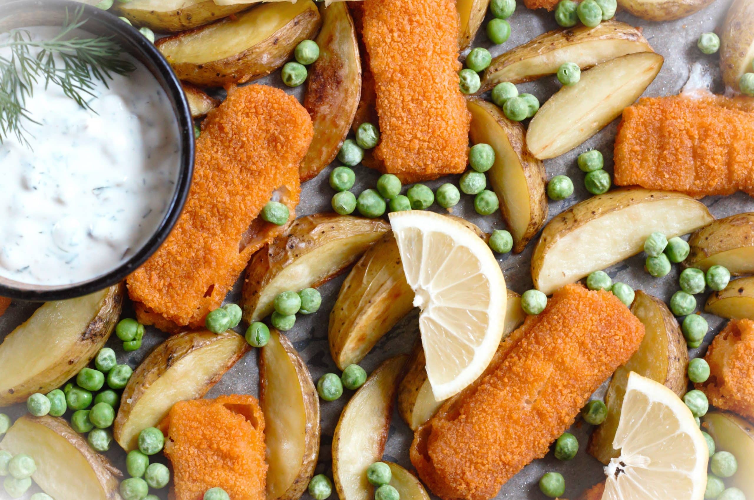 - Kaada lopuksi pellille perunoiden ja kalapuikkojen rakoihin pakasteherneitä. Anna olla uunissa vielä pari minuuttia.