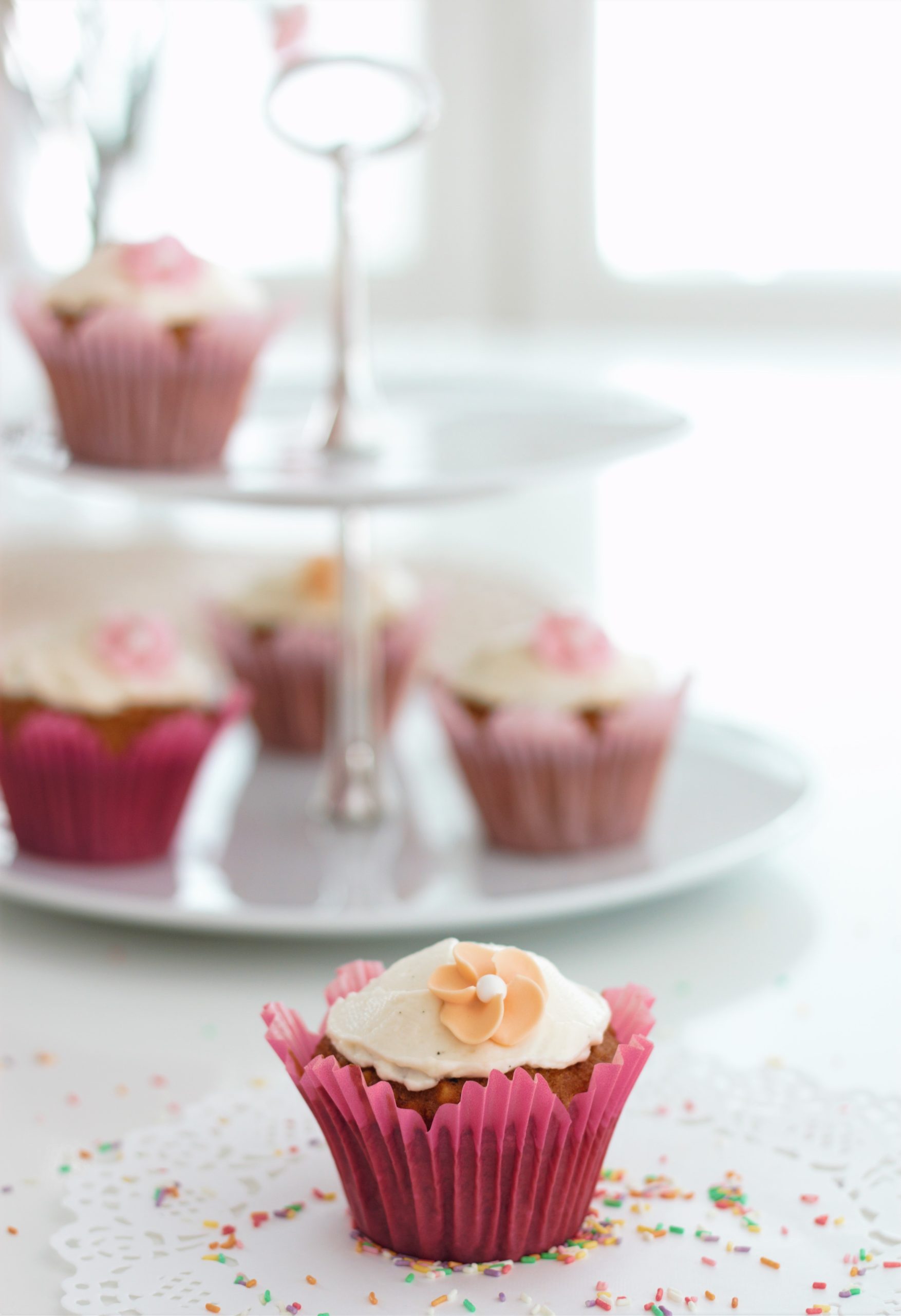 - Valmista kuorrute vatkaaamalla tuorejuusto, huoneen lämpöinen voi ja tomusokeri sekaisin sähkövatkaimella tai yleiskoneella. Levitä kuorrutetta jäähtyneiden muffinien päälle ja koristele halutessasi nonparelleilla tai muilla ihanilla leivoskoristeilla.
